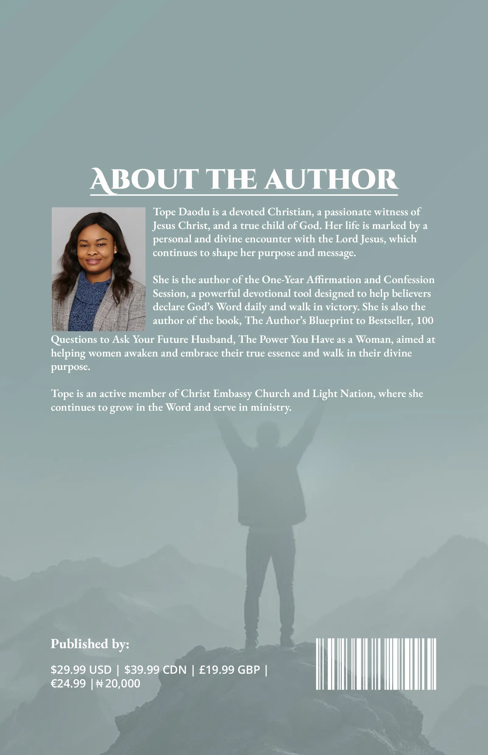 Tope Daodu is a devoted Christian, a passionate witness of Jesus Christ, and a true child of God. Her life is marked by a personal and divine encounter with the Lord Jesus, which continues to shape her purpose and message.
