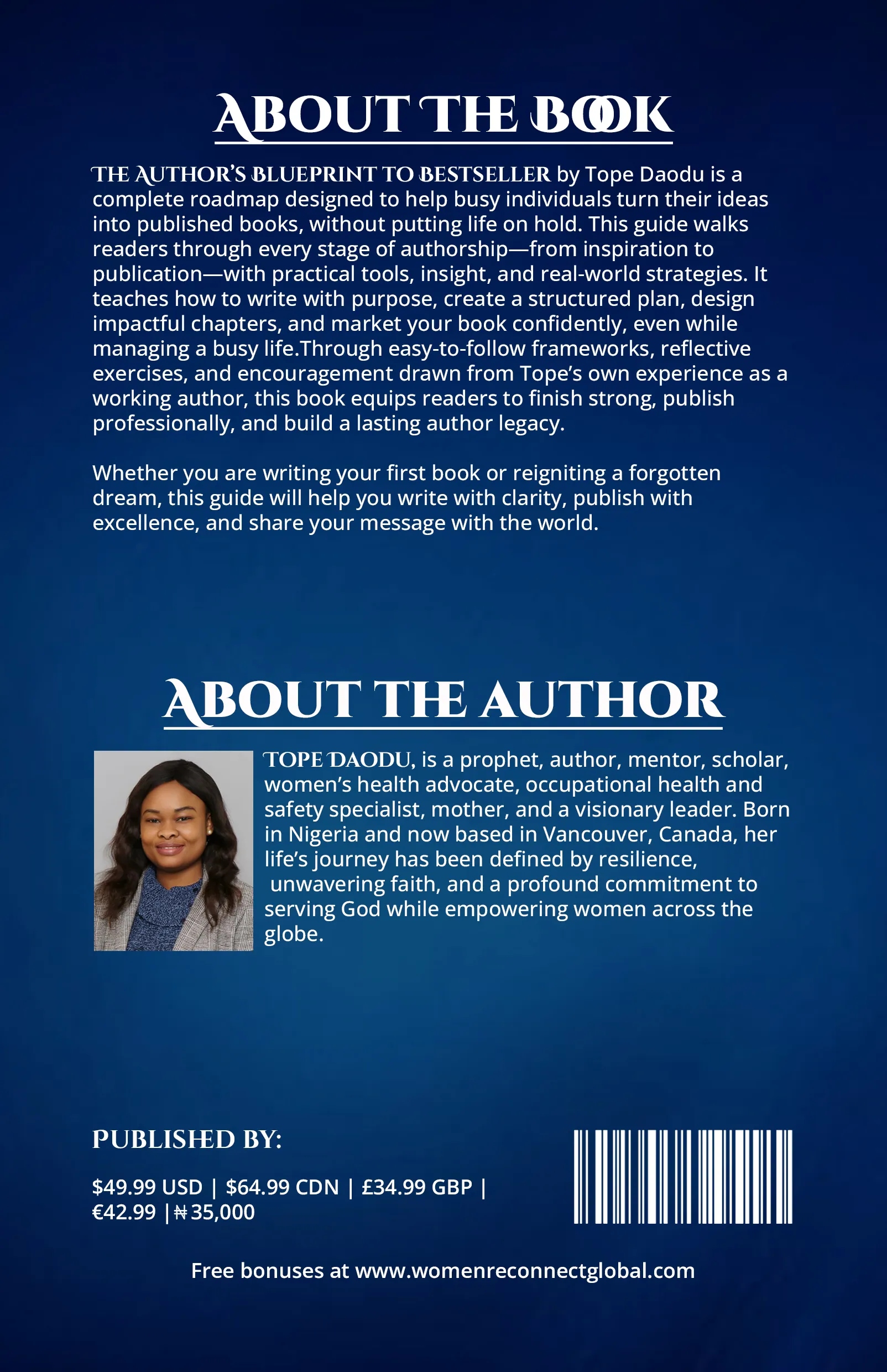 THE AUTHOR’S BLUEPRINT TO BESTSELLER by Tope Daodu is a complete roadmap designed to help busy individuals turn their ideas into published books, without putting life on hold. This guide walks readers through every stage of authorship—from inspiration to publication—with practical tools, insight, and real-world strategies. It teaches how to write with purpose, create a structured plan, design impactful chapters, and market your book confidently, even while managing a busy life. Through easy-to-follow frameworks, reflective exercises, and encouragement drawn from Tope’s own experience as a working author, this book equips readers to finish strong, publish professionally, and build a lasting author legacy.